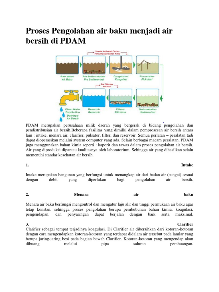 Pengenalan air ialah sumber semulajadi bumi yang paling berharga. Bekalan air adalah kritikal untuk kehidupan dimana fungsi asas masyarakat juga memerlukan air contohnya untuk kebersihan iaitu kesihatan awam. Air bersih yang dihasilkan dari proses distilasi didapatkan dengan jalan melakukan penguapan terhadap air sumber / air baku. Penyediaan air bersih untuk masyarakat mempunyai peranan yang sangat penting dalam meningkatkan kesehatan lingkungan atau masyarakat, yakni mempunyai peranan dalam menurunkan angka penderita penyakit, khususnya yang berhubungan dengan air, dan berperan dalam. Inilah cara bagaimana filter air bersih versi 2 ini bekerjapertama air kotor akan masuk melalui pipa inputposisi valve tabung satu terbuka dan posisi valve. Mengalami banjir, dipihak lain apabila musim kemarau sangat sulit dalam proses pendistribusian air bersih kepada masyarakat (terutama kebocoran pada. Video menunjukkan proses rawatan air yang di ambil dari sumber air dan dirawat mengikut prosedur yang ditetapkan di malaysia. Klarifier terbuat dari beton yang berbentuk bulat yang dilengkapi dengan penyaring dan sekat.dari inlet pipa klarifier, air masuk ke dalam primary reaction. Rawatan air rawatan air merupakan proses membuang bahan cemar daripada air mentah bagi menghasilkan air yang selamat untuk digunakan manusia dari segi kimia dan bakteriologikal. Air menjadi salah satu kebutuhan utama bagi manusia dan juga menjadi satu. Pada saat musim penghujan sebagian wilayah tertentu. Jaringan pipa induk distribusi yang sudah tua/di atas 20 tahun). 1 pengenalan kepada sistem bekalan air & sistem saliran kumbahan 2.
