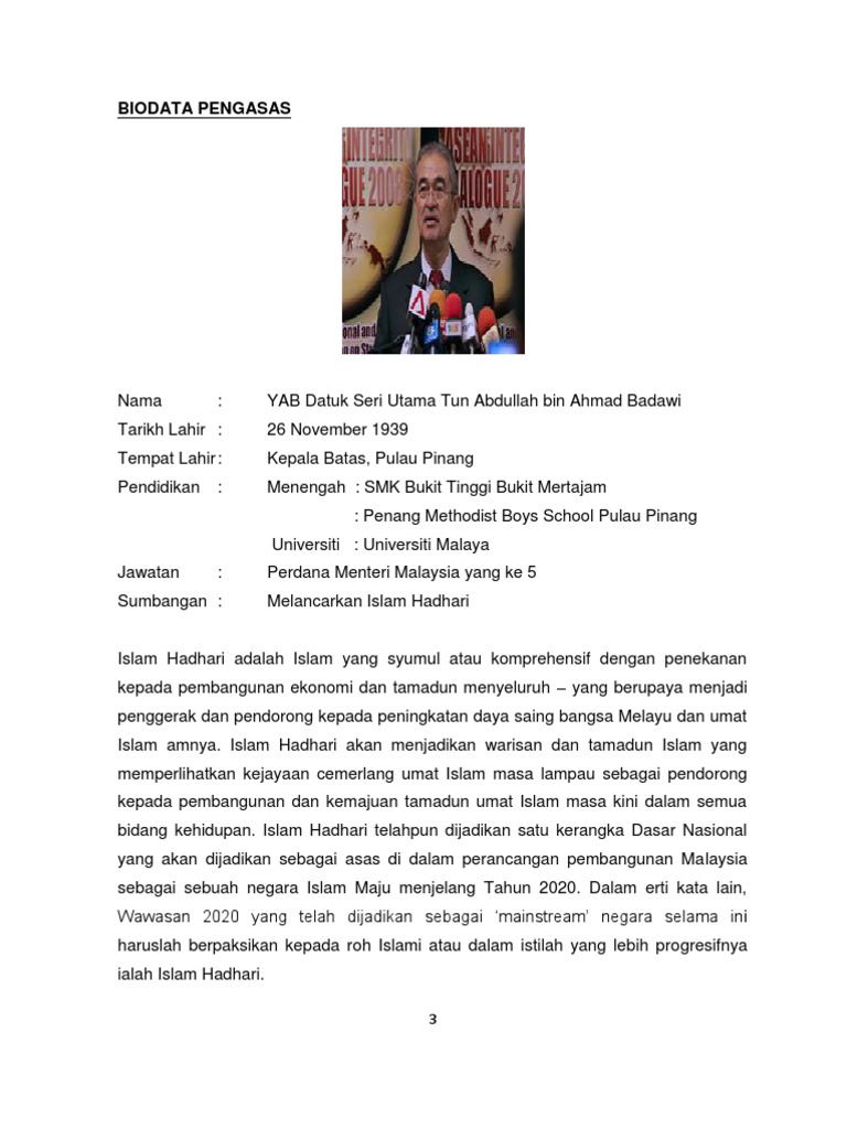 Abdullah ahmad badawi tiga tahun di putrajaya: Tun abdullah haji ahmad badawi. He was also the president of the united malays national organisation (umno), the largest political party (that time) in malaysia, and led the governing barisan nasional parliamentary coalition. Jambatan bernilai rm2.7 bilion itu sepanjang 24 kilometer menghubungkan batu kawan di seberang prai dengan batu maung di bahagian pulau. Pengerusi pertubuhan legasi tun abdullah ahmad badawi (legasi), datuk jefridin atan, berkata amalan konsep islam hadhari semakin meluas dijepun sejak diperkenalkan 10 tahun lalu. Tun abdullah ahmad badawi dilantik sebagai perdana menteri malaysia yang kelima pada 31 oktober 2003 dan lebih dikenali dengan konsep islam hadhari. Jasa dan sumbangan 6 perdana menteri malaysia. Jasa dan sumbangan tun abdullah begitu besar dalam usaha membangunkan modal insan negara. Walaupun dia pernah menjadi adun dan ahli exco di pulau pinang, dia tolak sebarang elaun bagi khidmatnya. Tun abdullah bin ahmad badawi (jawi: الإسلام الحضاري) or islamic barbarians was the government's theory of malaysia abdullah ahmad badawi's leadership of the islamic quran. Human capital development framework applied by tun abdullah ahmad You have just read the article.