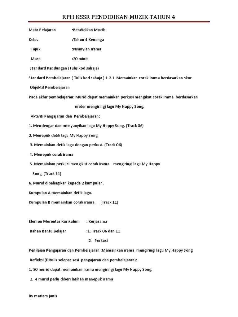 Rph kssr dunia muzik tahun 4 page 15. 16.4.2015 masa :30 minit tajuk : Rph kssr muzik tahun 3 mp3 & mp4. Semua pelajar tahun 5 tajuk : So please help us by uploading 1 new document or like us to download Rancangan pengajaran harian (rph) ialah satu rekod khas yang disediakan lebih awal oleh guru sebelum menjalankan sesi pengajaran dan pembelajaran. Rph muzik tahun 4 kssr. Download rph muzik tahun 4.docx. Download lagu selamat ulang tahun untuk diri sendiri mp3 & video gratis. Jumiati perkara catatan sasaran : Please copy and paste this embed script to where you want to embed. Rph kssr dunia muzik tahun 4. Terdapat 6 sample iaitu tahun 1, tahun 2, tahun 3, tahun 4 dan tahun 5 (kssr semakan) dan tahun 6 (kssr).